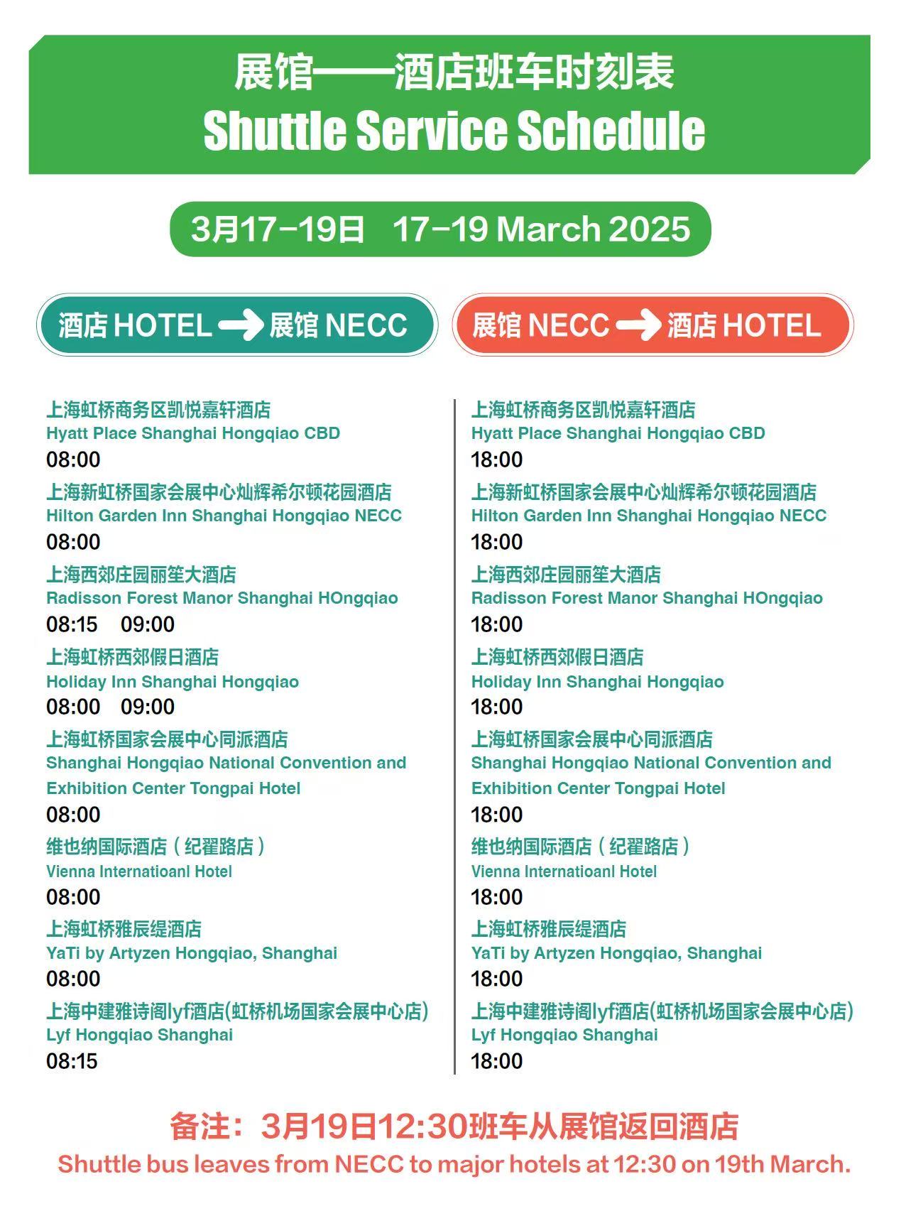 ◎接駁車:部分酒店提供至展館免費接駁班車,班車時刻表如下。
